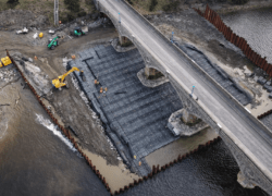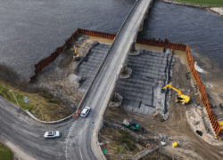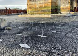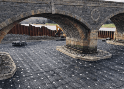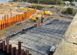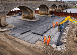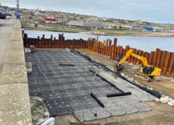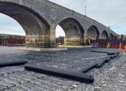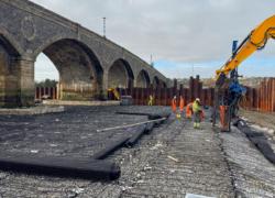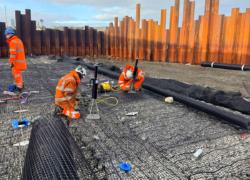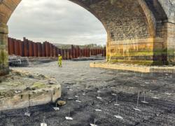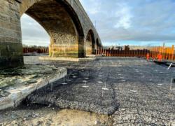 Installation was completed using machine-mounted equipment within sheet-piled areas installed to allow temporary dewatering during construction. Works are being carried out in two phases either side of the bridge within the tidal riverway.