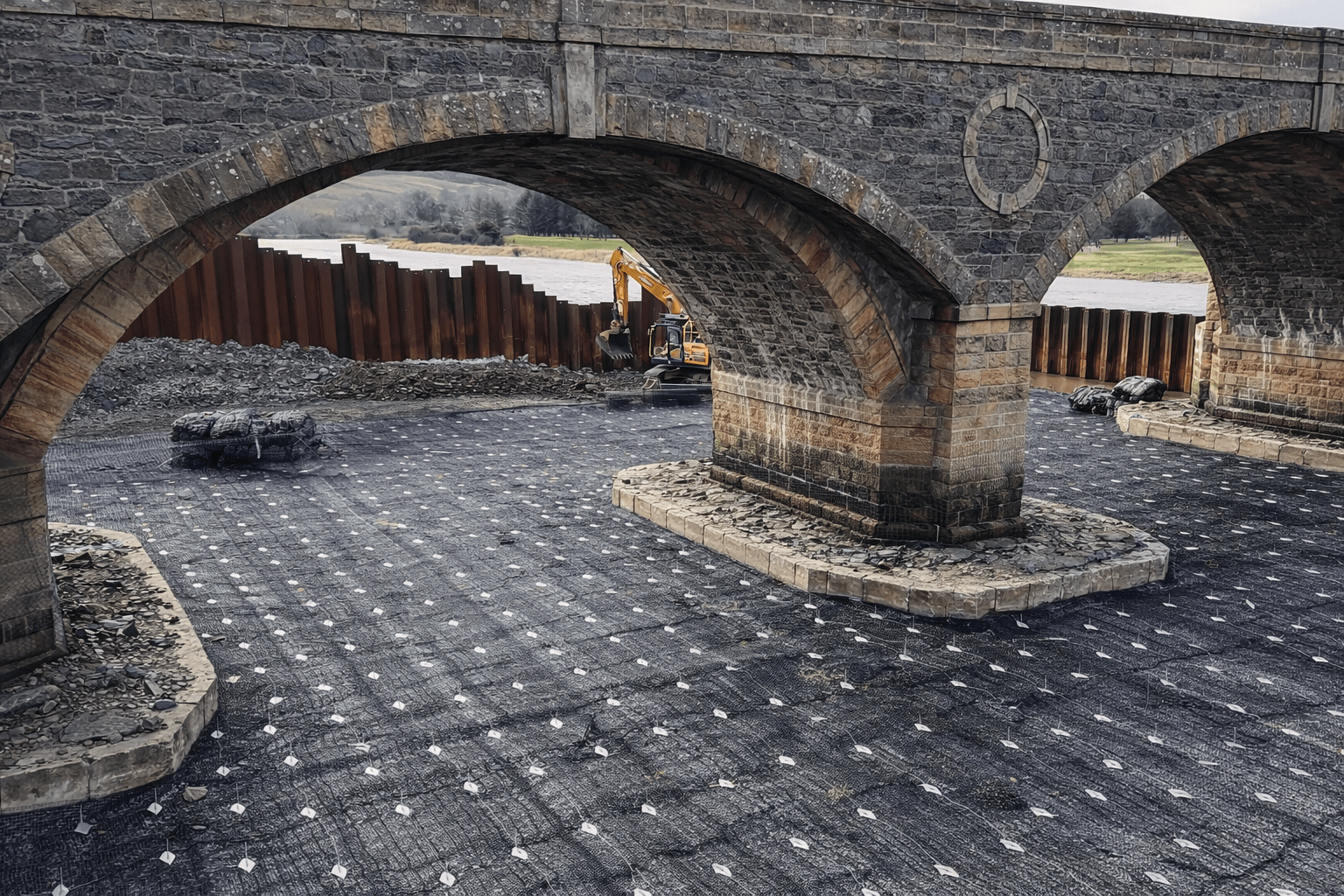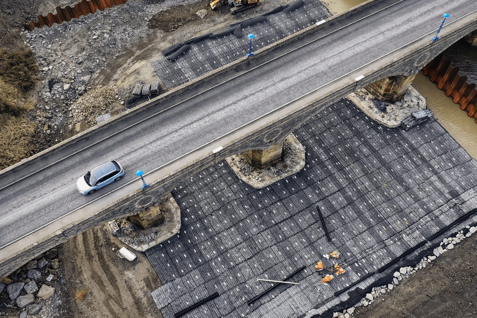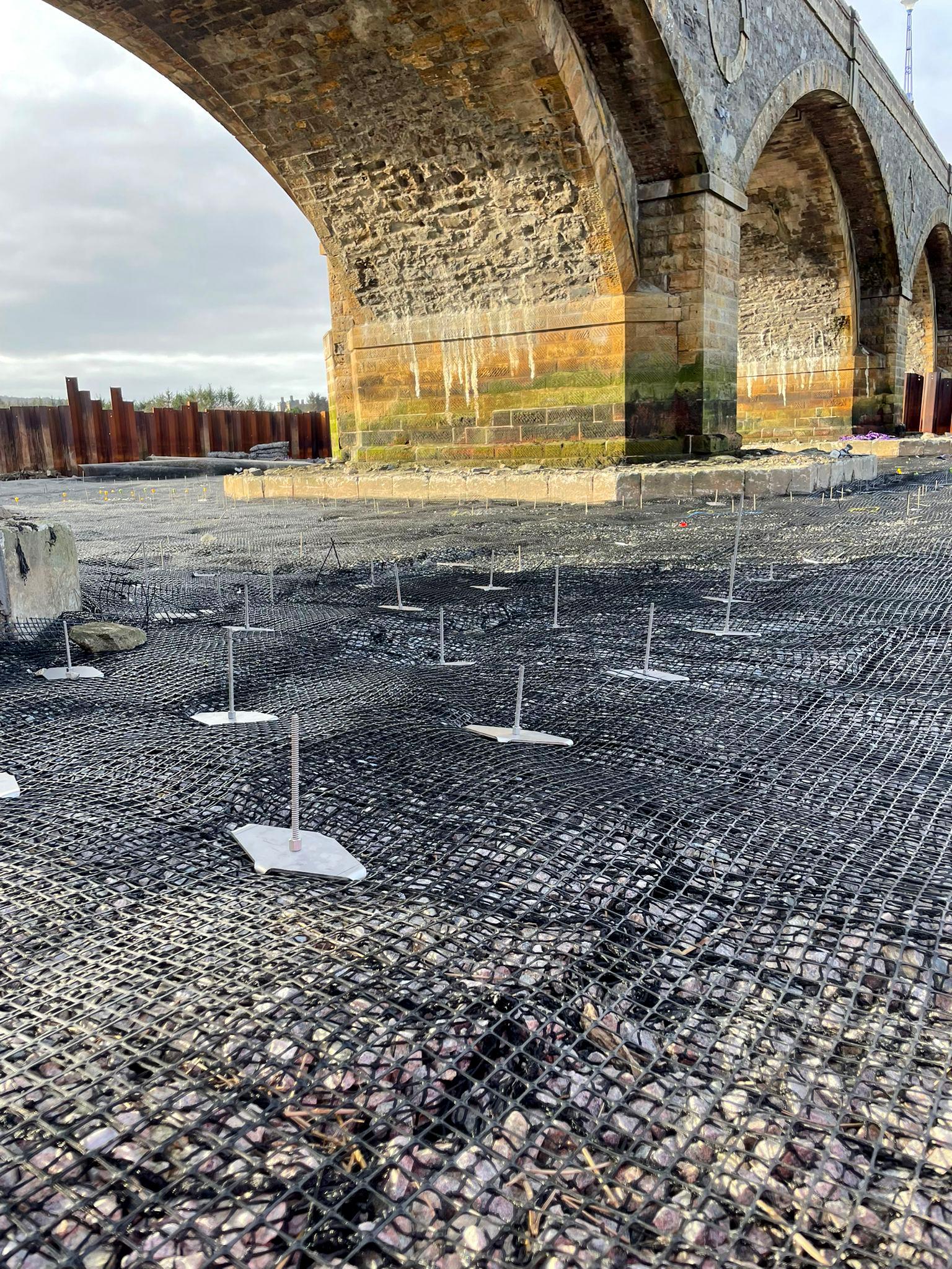 To protect the bridge, a scour protection system was designed using rock mattress units installed over concrete repair areas on the riverbed. These mattress systems needed to be securely fixed to prevent movement caused by water flow, tidal forces and storm conditions.