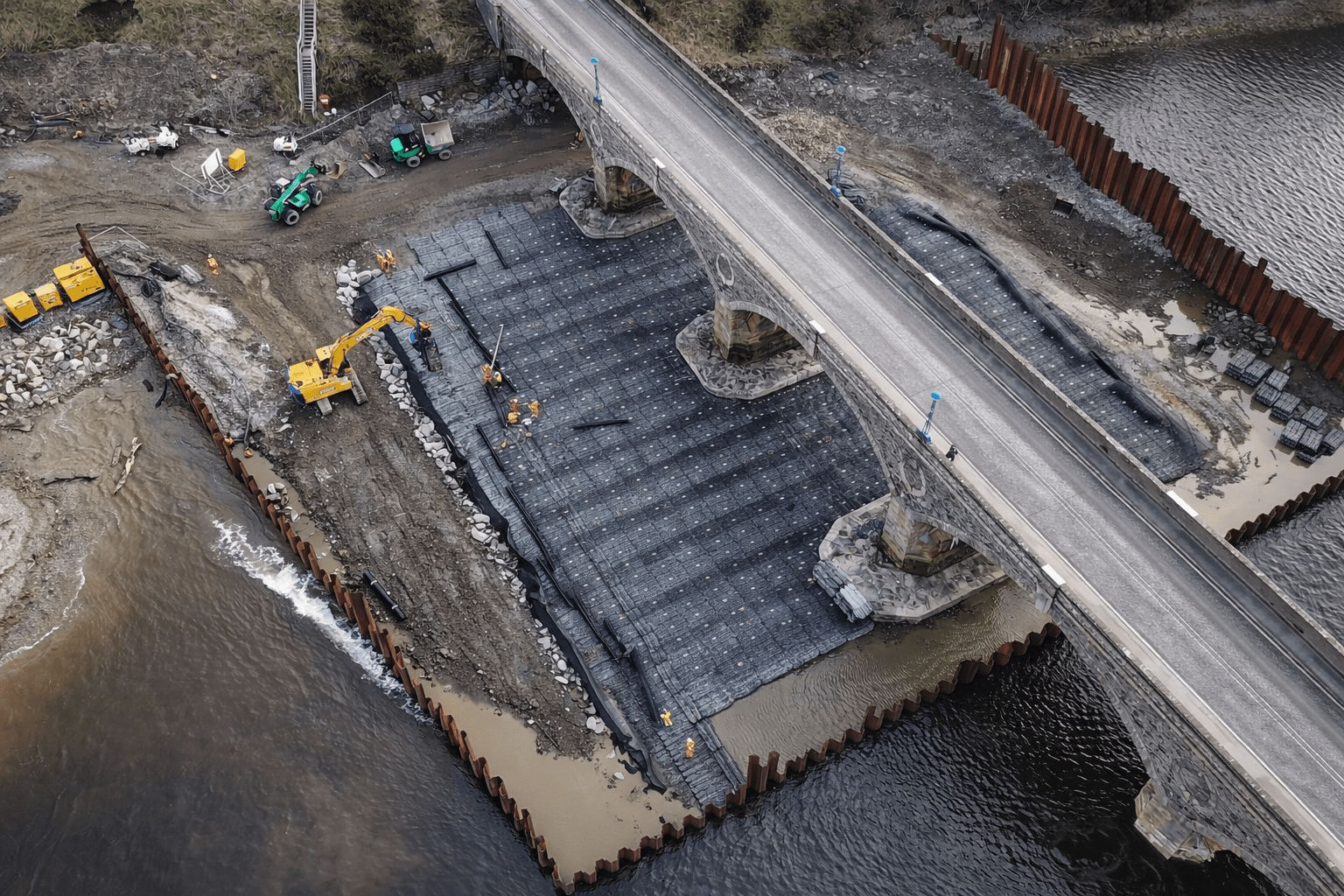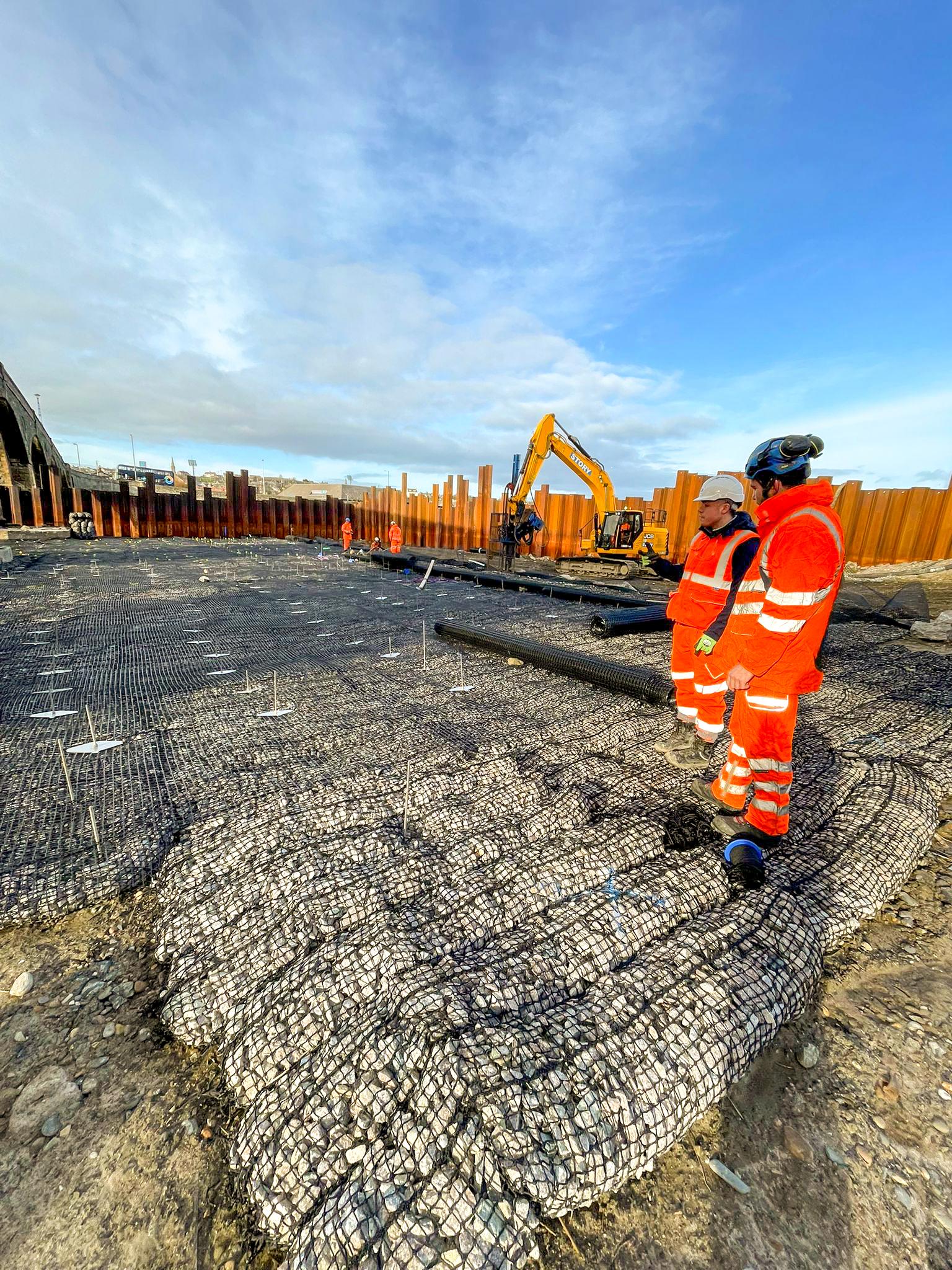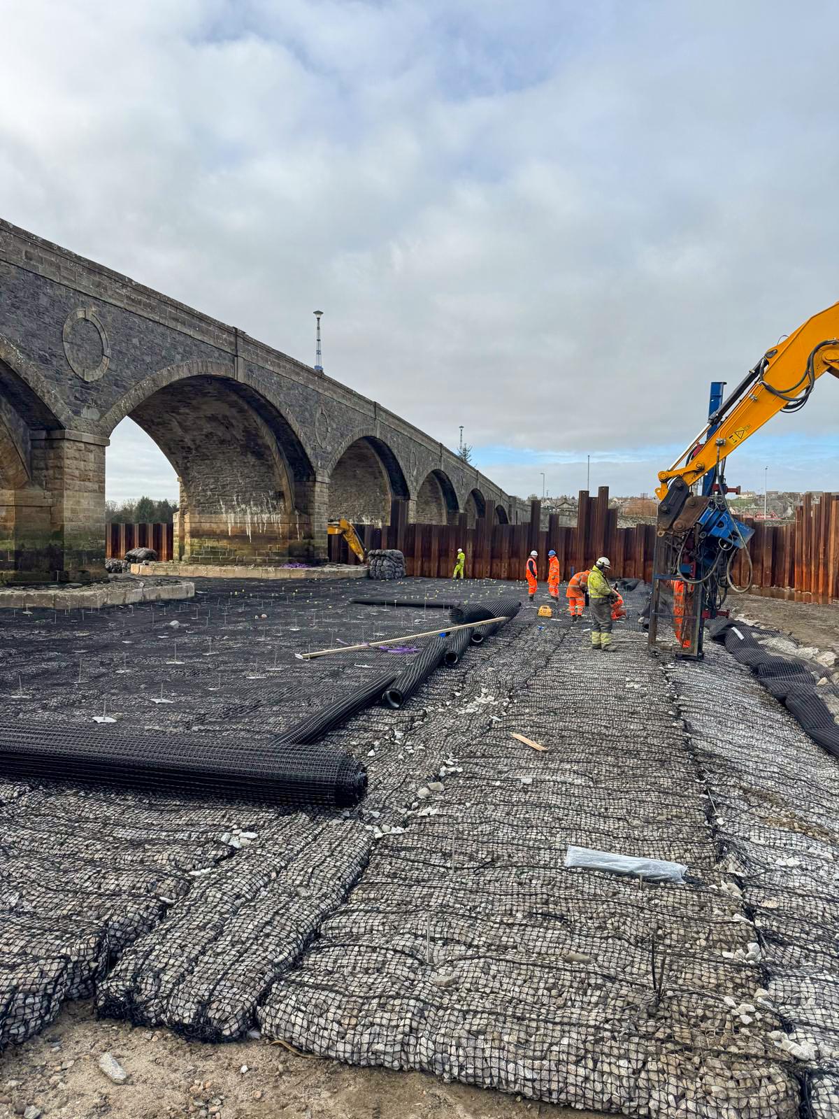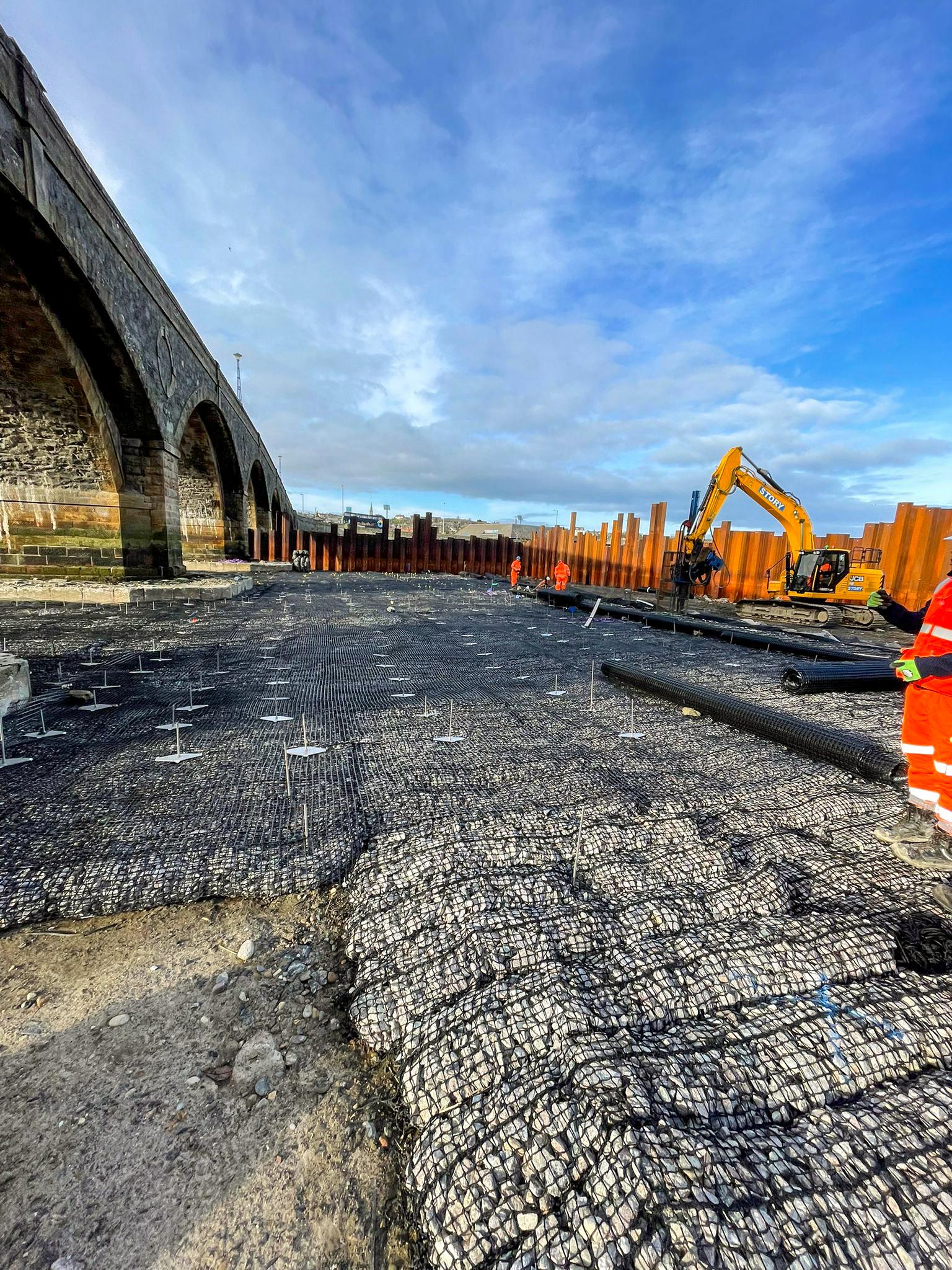 Installation was completed using machine-mounted equipment within sheet-piled areas installed to allow temporary dewatering during construction. Works are being carried out in two phases either side of the bridge within the tidal riverway.