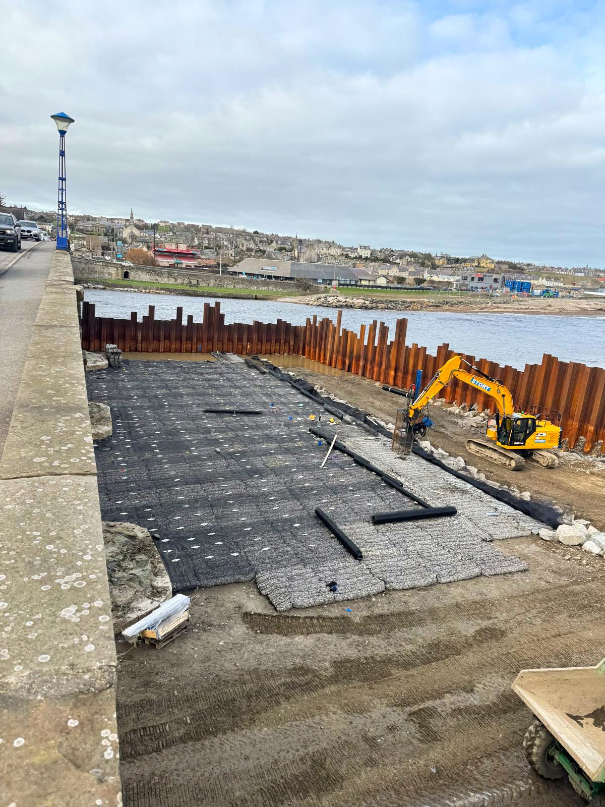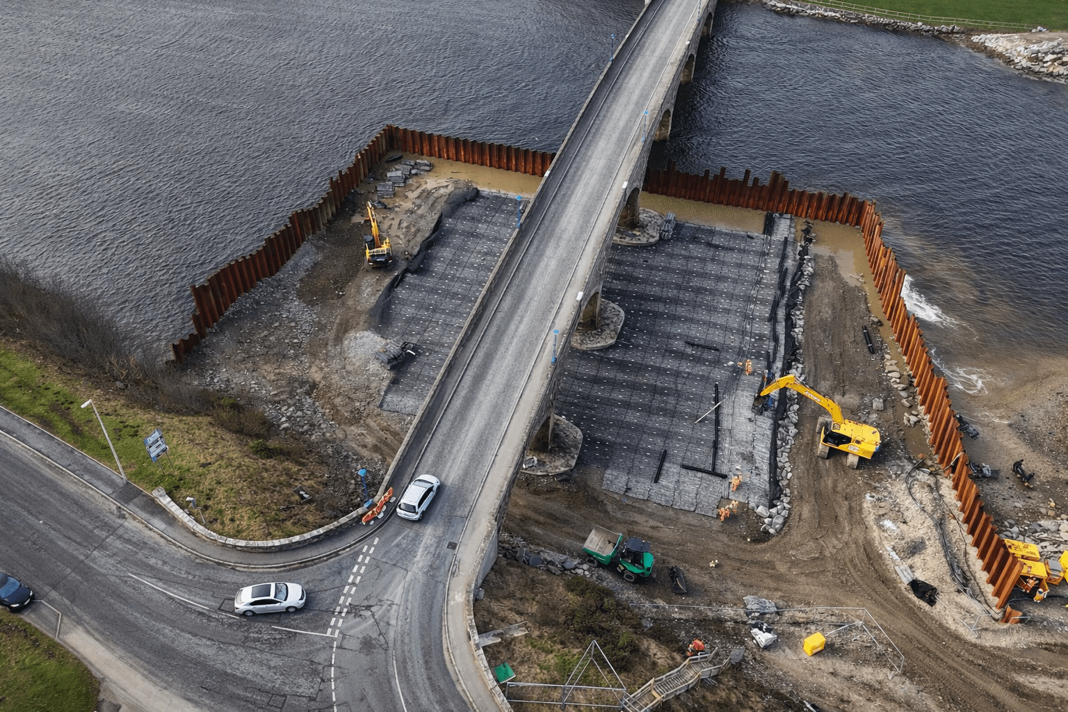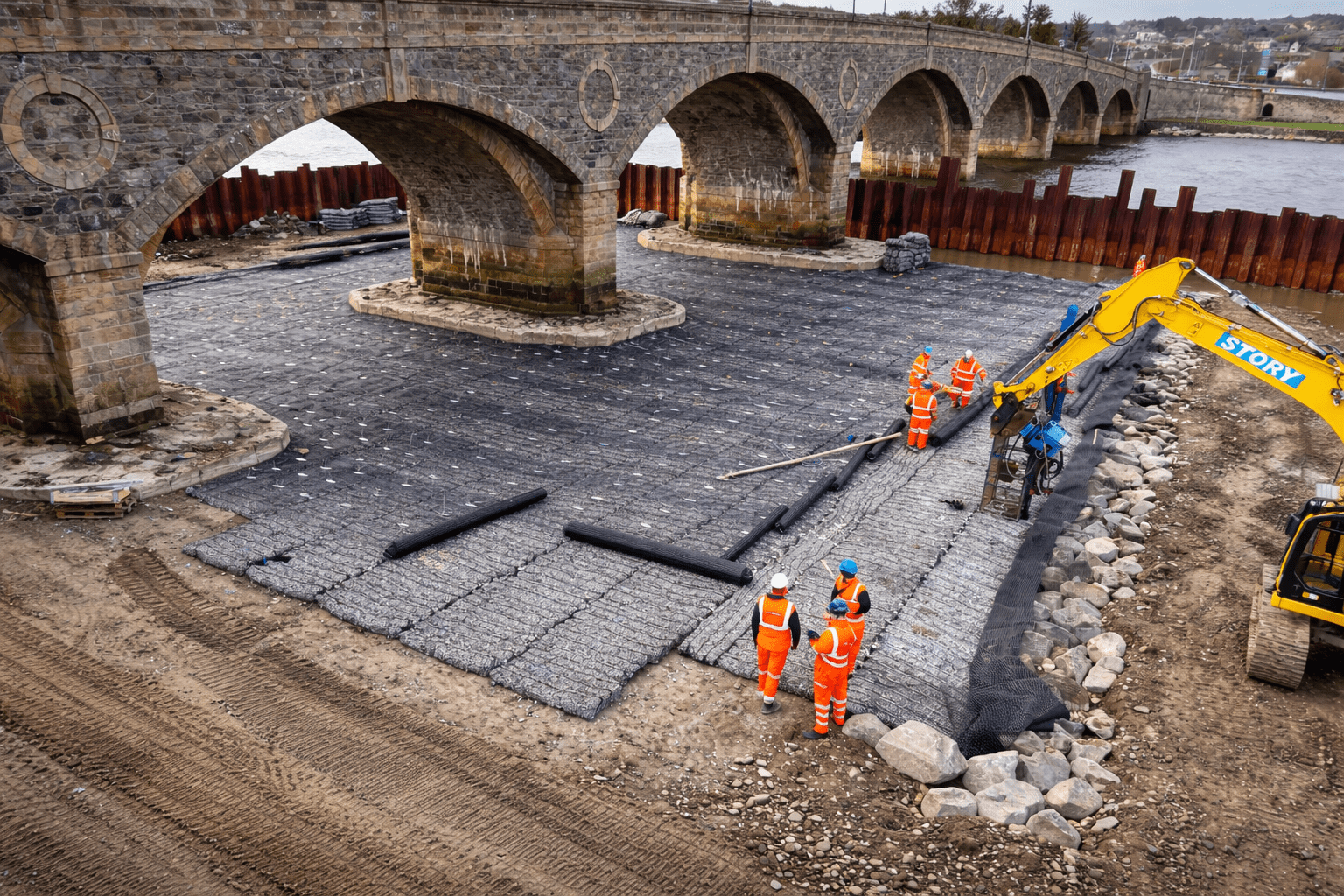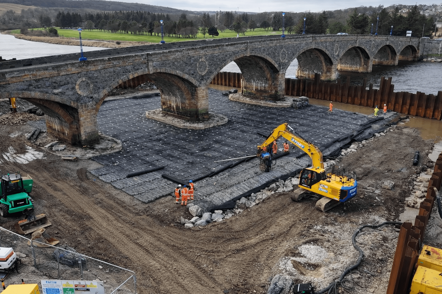 Installation was completed using machine-mounted equipment within sheet-piled areas installed to allow temporary dewatering during construction. Works are being carried out in two phases either side of the bridge within the tidal riverway.