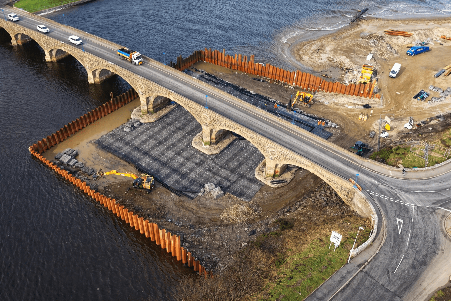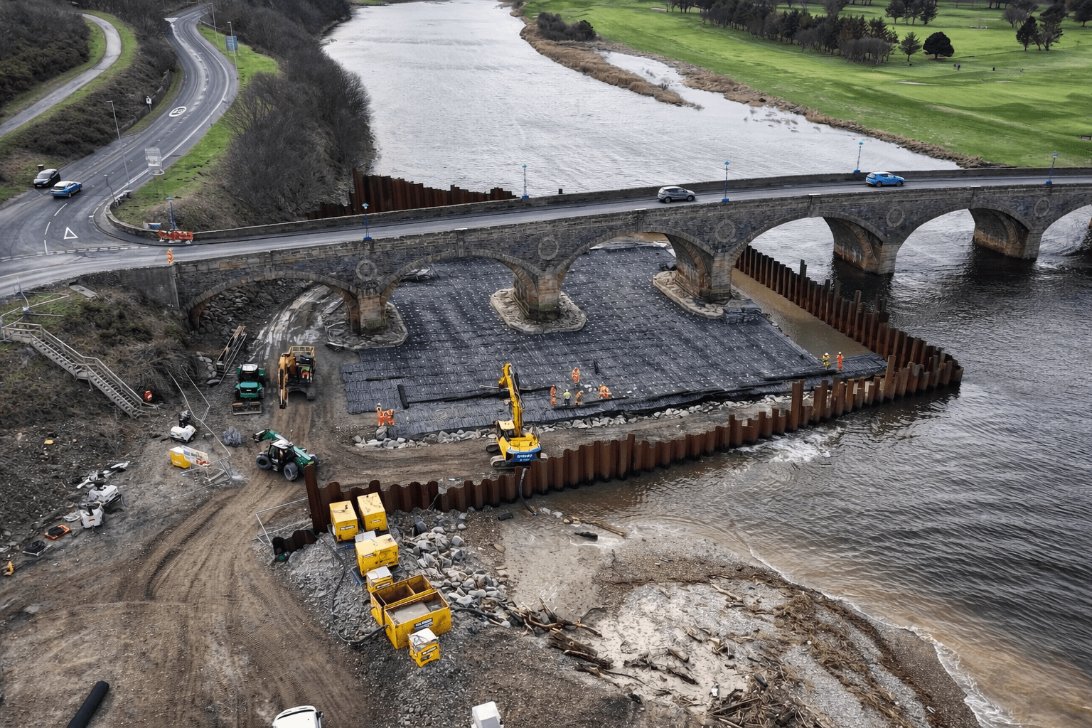 Banff Bridge on the A98 in Aberdeenshire required remedial works to address scour affecting the bridge foundations within the tidal river environment. Scour occurs when flowing water removes sediment from around structural foundations, potentially compromising long-term stability.