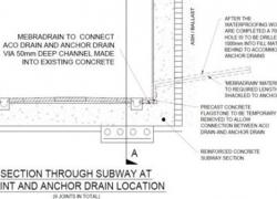 ASIL proposed the Anchor Drain solution which has been tried and tested on a number of structures over the years. The Anchor Drain is used to permanently dewater structures that do not have adequate drainage normally as a result of blocked drainage systems. ASIL provided the innovative retrofit technology expressly for aged and poorly drained structures. The Anchor Drain was tied into the existing ACO drain system that is used to carry water away from the structure as per the detail shown below.